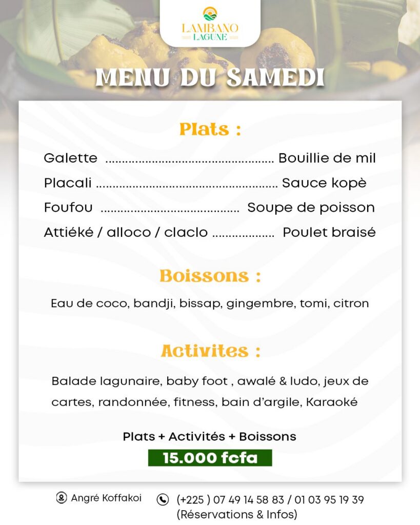 Cadre ideal pour profiter de la nature, pour un team building, des retrouvailles entre amis, en famille même en Amoureux, il y es possible de faire une randonnée une balade lagunaire un bain d’argile et jouer à des jeux comme le Ludo les cartes le baby-foot sans oublier les repas jus naturels le bandji le tout pour seulement 15000fcfa